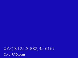 XYZ 9.125,3.882,45.616 Color is a normal indigo color and the nearest color is Zaffre #0014a8. Hex code #170bb8 and RGB value is rgb(23,11,184). In RGB color space, this color is composed of 9% red, 4% green, 72% blue, In CMYK color space, this color is composed of 88% cyan, 94% magenta, 0% yellow , 28% black , In HSL color space, this color has a hue angle of 244° , 89% saturation and 38% lightness.