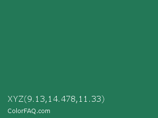 XYZ 9.13,14.478,11.33 Color is a dark green color and the nearest color is Eucalyptus #278a5b. Hex code #237857 and RGB value is rgb(35,120,87). In RGB color space, this color is composed of 14% red, 47% green, 34% blue, In CMYK color space, this color is composed of 71% cyan, 0% magenta, 28% yellow , 53% black , In HSL color space, this color has a hue angle of 157° , 55% saturation and 30% lightness.