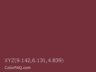 XYZ 9.142,6.131,4.839 Color is a normal red color and the nearest color is Wine #722f37. Hex code #752f3b and RGB value is rgb(117,47,59). In RGB color space, this color is composed of 46% red, 18% green, 23% blue, In CMYK color space, this color is composed of 0% cyan, 60% magenta, 50% yellow , 54% black , In HSL color space, this color has a hue angle of 350° , 43% saturation and 32% lightness.