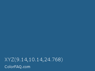 XYZ 9.14,10.14,24.768 Color is a normal blue color and the nearest color is B Dazzled Blue #2e5894. Hex code #235e88 and RGB value is rgb(35,94,136). In RGB color space, this color is composed of 14% red, 37% green, 53% blue, In CMYK color space, this color is composed of 74% cyan, 31% magenta, 0% yellow , 47% black , In HSL color space, this color has a hue angle of 205° , 59% saturation and 34% lightness.