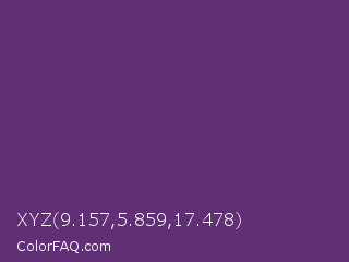 XYZ 9.157,5.859,17.478 Color is a normal purple color and the nearest color is Imperial #602f6b. Hex code #612f75 and RGB value is rgb(97,47,117). In RGB color space, this color is composed of 38% red, 18% green, 46% blue, In CMYK color space, this color is composed of 17% cyan, 60% magenta, 0% yellow , 54% black , In HSL color space, this color has a hue angle of 283° , 43% saturation and 32% lightness.