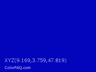 XYZ 9.169,3.759,47.819 Color is a normal blue color and the nearest color is Dark Blue #0000c8. Hex code #0305bc and RGB value is rgb(3,5,188). In RGB color space, this color is composed of 1% red, 2% green, 74% blue, In CMYK color space, this color is composed of 98% cyan, 97% magenta, 0% yellow , 26% black , In HSL color space, this color has a hue angle of 239° , 97% saturation and 37% lightness.