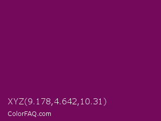 XYZ 9.178,4.642,10.31 Color is a dark magenta color and the nearest color is French Plum #811453. Hex code #74085b and RGB value is rgb(116,8,91). In RGB color space, this color is composed of 45% red, 3% green, 36% blue, In CMYK color space, this color is composed of 0% cyan, 93% magenta, 22% yellow , 55% black , In HSL color space, this color has a hue angle of 314° , 87% saturation and 24% lightness.