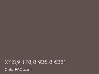 XYZ 9.178,8.936,8.638 Color is a normal red color and the nearest color is Wenge #645452. Hex code #60514f and RGB value is rgb(96,81,79). In RGB color space, this color is composed of 38% red, 32% green, 31% blue, In CMYK color space, this color is composed of 0% cyan, 16% magenta, 18% yellow , 62% black , In HSL color space, this color has a hue angle of 7° , 10% saturation and 34% lightness.