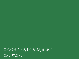 XYZ 9.179,14.932,8.36 Color is a normal green color and the nearest color is Goblin #3d7d52. Hex code #2d7a47 and RGB value is rgb(45,122,71). In RGB color space, this color is composed of 18% red, 48% green, 28% blue, In CMYK color space, this color is composed of 63% cyan, 0% magenta, 42% yellow , 52% black , In HSL color space, this color has a hue angle of 140° , 46% saturation and 33% lightness.