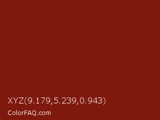 XYZ 9.179,5.239,0.943 Color is a dark red color and the nearest color is Kenyan Copper #7c1c05. Hex code #7f190e and RGB value is rgb(127,25,14). In RGB color space, this color is composed of 50% red, 10% green, 5% blue, In CMYK color space, this color is composed of 0% cyan, 80% magenta, 89% yellow , 50% black , In HSL color space, this color has a hue angle of 6° , 80% saturation and 28% lightness.