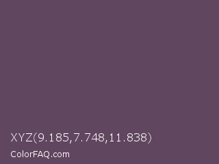 XYZ 9.185,7.748,11.838 Color is a normal magenta color and the nearest color is English Violet #563c5c. Hex code #61465f and RGB value is rgb(97,70,95). In RGB color space, this color is composed of 38% red, 27% green, 37% blue, In CMYK color space, this color is composed of 0% cyan, 28% magenta, 2% yellow , 62% black , In HSL color space, this color has a hue angle of 304° , 16% saturation and 33% lightness.