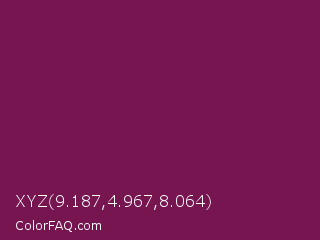 XYZ 9.187,4.967,8.064 Color is a dark magenta color and the nearest color is Pansy Purple #78184a. Hex code #761550 and RGB value is rgb(118,21,80). In RGB color space, this color is composed of 46% red, 8% green, 31% blue, In CMYK color space, this color is composed of 0% cyan, 82% magenta, 32% yellow , 54% black , In HSL color space, this color has a hue angle of 324° , 70% saturation and 27% lightness.