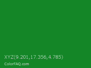 XYZ 9.201,17.356,4.785 Color is a dark green color and the nearest color is Forest Green #228b22. Hex code #158627 and RGB value is rgb(21,134,39). In RGB color space, this color is composed of 8% red, 53% green, 15% blue, In CMYK color space, this color is composed of 84% cyan, 0% magenta, 71% yellow , 47% black , In HSL color space, this color has a hue angle of 130° , 73% saturation and 30% lightness.