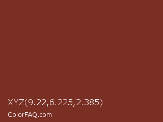 XYZ 9.22,6.225,2.385 Color is a normal red color and the nearest color is Red Robin #80341f. Hex code #792f24 and RGB value is rgb(121,47,36). In RGB color space, this color is composed of 47% red, 18% green, 14% blue, In CMYK color space, this color is composed of 0% cyan, 61% magenta, 70% yellow , 53% black , In HSL color space, this color has a hue angle of 8° , 54% saturation and 31% lightness.