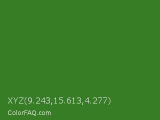XYZ 9.243,15.613,4.277 Color is a normal green color and the nearest color is Bilbao #327c14. Hex code #377d25 and RGB value is rgb(55,125,37). In RGB color space, this color is composed of 22% red, 49% green, 15% blue, In CMYK color space, this color is composed of 56% cyan, 0% magenta, 70% yellow , 51% black , In HSL color space, this color has a hue angle of 108° , 54% saturation and 32% lightness.