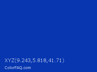 XYZ 9.243,5.818,41.71 Color is a normal blue color and the nearest color is UA Blue #0033aa. Hex code #0736b0 and RGB value is rgb(7,54,176). In RGB color space, this color is composed of 3% red, 21% green, 69% blue, In CMYK color space, this color is composed of 96% cyan, 69% magenta, 0% yellow , 31% black , In HSL color space, this color has a hue angle of 223° , 92% saturation and 36% lightness.
