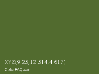 XYZ 9.25,12.514,4.617 Color is a dark green color and the nearest color is Dark Olive Green #556b2f. Hex code #526b2f and RGB value is rgb(82,107,47). In RGB color space, this color is composed of 32% red, 42% green, 18% blue, In CMYK color space, this color is composed of 23% cyan, 0% magenta, 56% yellow , 58% black , In HSL color space, this color has a hue angle of 85° , 39% saturation and 30% lightness.
