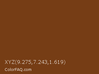XYZ 9.275,7.243,1.619 Color is a dark orange color and the nearest color is Walnut #773f1a. Hex code #763d15 and RGB value is rgb(118,61,21). In RGB color space, this color is composed of 46% red, 24% green, 8% blue, In CMYK color space, this color is composed of 0% cyan, 48% magenta, 82% yellow , 54% black , In HSL color space, this color has a hue angle of 25° , 70% saturation and 27% lightness.
