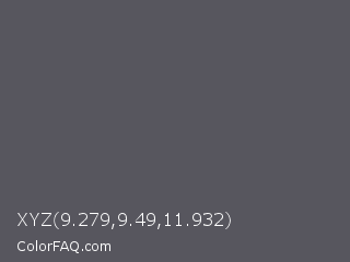 XYZ 9.279,9.49,11.932 Color is a normal indigo color and the nearest color is Scarpa Flow #585562. Hex code #57565e and RGB value is rgb(87,86,94). In RGB color space, this color is composed of 34% red, 34% green, 37% blue, In CMYK color space, this color is composed of 7% cyan, 9% magenta, 0% yellow , 63% black , In HSL color space, this color has a hue angle of 248° , 4% saturation and 35% lightness.