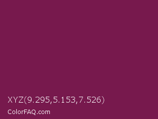 XYZ 9.295,5.153,7.526 Color is a dark magenta color and the nearest color is Pansy Purple #78184a. Hex code #77194d and RGB value is rgb(119,25,77). In RGB color space, this color is composed of 47% red, 10% green, 30% blue, In CMYK color space, this color is composed of 0% cyan, 79% magenta, 35% yellow , 53% black , In HSL color space, this color has a hue angle of 327° , 65% saturation and 28% lightness.