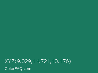 XYZ 9.329,14.721,13.176 Color is a dark cyan color and the nearest color is Deep Green Cyan Turquoise #0e7c61. Hex code #1a795f and RGB value is rgb(26,121,95). In RGB color space, this color is composed of 10% red, 47% green, 37% blue, In CMYK color space, this color is composed of 79% cyan, 0% magenta, 21% yellow , 53% black , In HSL color space, this color has a hue angle of 164° , 65% saturation and 29% lightness.