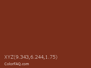 XYZ 9.343,6.244,1.75 Color is a dark red color and the nearest color is Mocha #782d19. Hex code #7b2e1b and RGB value is rgb(123,46,27). In RGB color space, this color is composed of 48% red, 18% green, 11% blue, In CMYK color space, this color is composed of 0% cyan, 63% magenta, 78% yellow , 52% black , In HSL color space, this color has a hue angle of 12° , 64% saturation and 29% lightness.