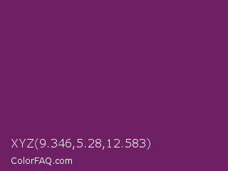 XYZ 9.346,5.28,12.583 Color is a dark magenta color and the nearest color is Byzantium #702963. Hex code #6f1f64 and RGB value is rgb(111,31,100). In RGB color space, this color is composed of 44% red, 12% green, 39% blue, In CMYK color space, this color is composed of 0% cyan, 72% magenta, 10% yellow , 56% black , In HSL color space, this color has a hue angle of 308° , 56% saturation and 28% lightness.