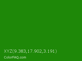 XYZ 9.383,17.902,3.191 Color is a dark green color and the nearest color is India Green #138808. Hex code #1e8808 and RGB value is rgb(30,136,8). In RGB color space, this color is composed of 12% red, 53% green, 3% blue, In CMYK color space, this color is composed of 78% cyan, 0% magenta, 94% yellow , 47% black , In HSL color space, this color has a hue angle of 110° , 89% saturation and 28% lightness.