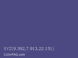 XYZ 9.392,7.913,22.151 Color is a normal indigo color and the nearest color is Purple Navy #4e5180. Hex code #4c4982 and RGB value is rgb(76,73,130). In RGB color space, this color is composed of 30% red, 29% green, 51% blue, In CMYK color space, this color is composed of 42% cyan, 44% magenta, 0% yellow , 49% black , In HSL color space, this color has a hue angle of 243° , 28% saturation and 40% lightness.