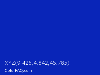 XYZ 9.426,4.842,45.785 Color is a normal blue color and the nearest color is International Klein Blue #002fa7. Hex code #0925b8 and RGB value is rgb(9,37,184). In RGB color space, this color is composed of 4% red, 15% green, 72% blue, In CMYK color space, this color is composed of 95% cyan, 80% magenta, 0% yellow , 28% black , In HSL color space, this color has a hue angle of 230° , 91% saturation and 38% lightness.