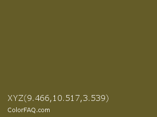 XYZ 9.466,10.517,3.539 Color is a dark yellow color and the nearest color is Costa Del Sol #615d30. Hex code #645c28 and RGB value is rgb(100,92,40). In RGB color space, this color is composed of 39% red, 36% green, 16% blue, In CMYK color space, this color is composed of 0% cyan, 8% magenta, 60% yellow , 61% black , In HSL color space, this color has a hue angle of 52° , 43% saturation and 27% lightness.