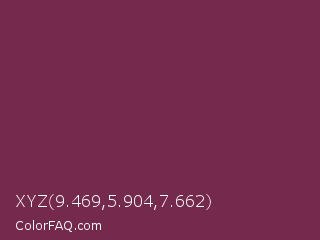 XYZ 9.469,5.904,7.662 Color is a normal rose color and the nearest color is Finn #692d54. Hex code #75294d and RGB value is rgb(117,41,77). In RGB color space, this color is composed of 46% red, 16% green, 30% blue, In CMYK color space, this color is composed of 0% cyan, 65% magenta, 34% yellow , 54% black , In HSL color space, this color has a hue angle of 332° , 48% saturation and 31% lightness.