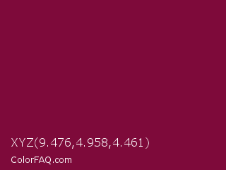 XYZ 9.476,4.958,4.461 Color is a dark rose color and the nearest color is Siren #7a013a. Hex code #7e0a3a and RGB value is rgb(126,10,58). In RGB color space, this color is composed of 49% red, 4% green, 23% blue, In CMYK color space, this color is composed of 0% cyan, 92% magenta, 54% yellow , 51% black , In HSL color space, this color has a hue angle of 335° , 85% saturation and 27% lightness.