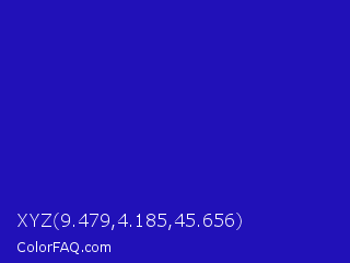 XYZ 9.479,4.185,45.656 Color is a normal indigo color and the nearest color is Interdimensional Blue #360ccc. Hex code #2111b8 and RGB value is rgb(33,17,184). In RGB color space, this color is composed of 13% red, 7% green, 72% blue, In CMYK color space, this color is composed of 82% cyan, 91% magenta, 0% yellow , 28% black , In HSL color space, this color has a hue angle of 246° , 83% saturation and 39% lightness.