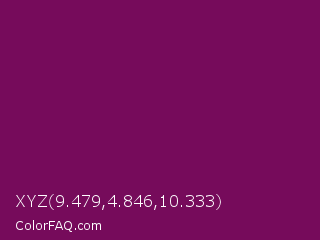 XYZ 9.479,4.846,10.333 Color is a dark magenta color and the nearest color is French Plum #811453. Hex code #760b5b and RGB value is rgb(118,11,91). In RGB color space, this color is composed of 46% red, 4% green, 36% blue, In CMYK color space, this color is composed of 0% cyan, 91% magenta, 23% yellow , 54% black , In HSL color space, this color has a hue angle of 315° , 83% saturation and 25% lightness.