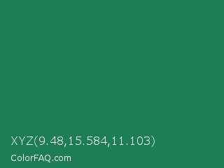 XYZ 9.48,15.584,11.103 Color is a dark green color and the nearest color is Eucalyptus #278a5b. Hex code #1d7d55 and RGB value is rgb(29,125,85). In RGB color space, this color is composed of 11% red, 49% green, 33% blue, In CMYK color space, this color is composed of 77% cyan, 0% magenta, 32% yellow , 51% black , In HSL color space, this color has a hue angle of 155° , 62% saturation and 30% lightness.