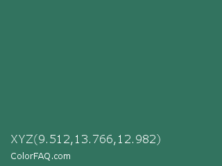 XYZ 9.512,13.766,12.982 Color is a normal green color and the nearest color is Amazon #3b7a57. Hex code #32735f and RGB value is rgb(50,115,95). In RGB color space, this color is composed of 20% red, 45% green, 37% blue, In CMYK color space, this color is composed of 57% cyan, 0% magenta, 17% yellow , 55% black , In HSL color space, this color has a hue angle of 162° , 39% saturation and 32% lightness.