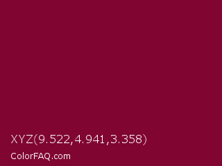 XYZ 9.522,4.941,3.358 Color is a dark rose color and the nearest color is Siren #7a013a. Hex code #800631 and RGB value is rgb(128,6,49). In RGB color space, this color is composed of 50% red, 2% green, 19% blue, In CMYK color space, this color is composed of 0% cyan, 95% magenta, 62% yellow , 50% black , In HSL color space, this color has a hue angle of 339° , 91% saturation and 26% lightness.