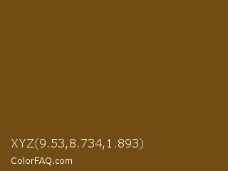 XYZ 9.53,8.734,1.893 Color is a dark orange color and the nearest color is Raw Umber #734a12. Hex code #714c15 and RGB value is rgb(113,76,21). In RGB color space, this color is composed of 44% red, 30% green, 8% blue, In CMYK color space, this color is composed of 0% cyan, 33% magenta, 81% yellow , 56% black , In HSL color space, this color has a hue angle of 36° , 69% saturation and 26% lightness.