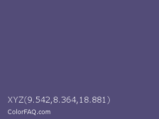 XYZ 9.542,8.364,18.881 Color is a normal indigo color and the nearest color is Purple Navy #4e5180. Hex code #534c78 and RGB value is rgb(83,76,120). In RGB color space, this color is composed of 33% red, 30% green, 47% blue, In CMYK color space, this color is composed of 31% cyan, 37% magenta, 0% yellow , 53% black , In HSL color space, this color has a hue angle of 250° , 22% saturation and 38% lightness.