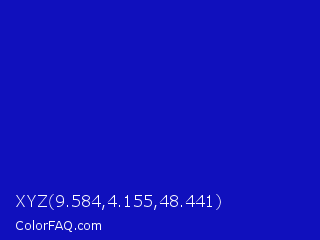 XYZ 9.584,4.155,48.441 Color is a normal blue color and the nearest color is Dark Blue #0000c8. Hex code #1010bd and RGB value is rgb(16,16,189). In RGB color space, this color is composed of 6% red, 6% green, 74% blue, In CMYK color space, this color is composed of 92% cyan, 92% magenta, 0% yellow , 26% black , In HSL color space, this color has a hue angle of 240° , 84% saturation and 40% lightness.