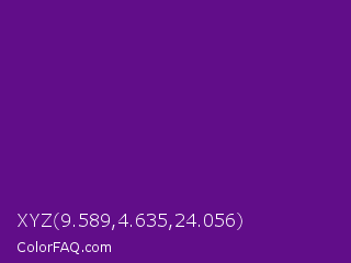 XYZ 9.589,4.635,24.056 Color is a dark purple color and the nearest color is Purple #660099. Hex code #610d89 and RGB value is rgb(97,13,137). In RGB color space, this color is composed of 38% red, 5% green, 54% blue, In CMYK color space, this color is composed of 29% cyan, 91% magenta, 0% yellow , 46% black , In HSL color space, this color has a hue angle of 281° , 83% saturation and 29% lightness.