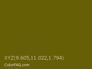 XYZ 9.605,11.022,1.794 Color is a very dark yellow color and the nearest color is Spicy Mustard #74640d. Hex code #665f06 and RGB value is rgb(102,95,6). In RGB color space, this color is composed of 40% red, 37% green, 2% blue, In CMYK color space, this color is composed of 0% cyan, 7% magenta, 94% yellow , 60% black , In HSL color space, this color has a hue angle of 56° , 89% saturation and 21% lightness.