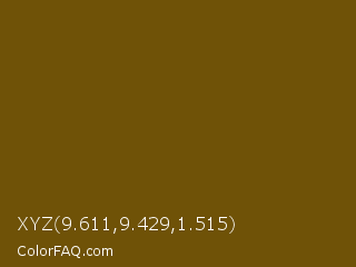 XYZ 9.611,9.429,1.515 Color is a dark orange color and the nearest color is Antique Bronze #704a07. Hex code #6f5207 and RGB value is rgb(111,82,7). In RGB color space, this color is composed of 44% red, 32% green, 3% blue, In CMYK color space, this color is composed of 0% cyan, 26% magenta, 94% yellow , 56% black , In HSL color space, this color has a hue angle of 43° , 88% saturation and 23% lightness.