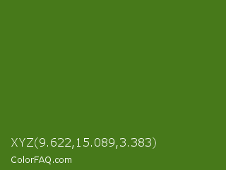 XYZ 9.622,15.089,3.383 Color is a dark green color and the nearest color is Sap Green #507d2a. Hex code #47791a and RGB value is rgb(71,121,26). In RGB color space, this color is composed of 28% red, 47% green, 10% blue, In CMYK color space, this color is composed of 41% cyan, 0% magenta, 79% yellow , 53% black , In HSL color space, this color has a hue angle of 92° , 65% saturation and 29% lightness.