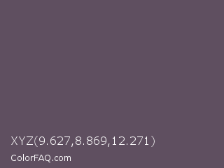 XYZ 9.627,8.869,12.271 Color is a normal magenta color and the nearest color is Scarpa Flow #585562. Hex code #5f4f60 and RGB value is rgb(95,79,96). In RGB color space, this color is composed of 37% red, 31% green, 38% blue, In CMYK color space, this color is composed of 1% cyan, 18% magenta, 0% yellow , 62% black , In HSL color space, this color has a hue angle of 296° , 10% saturation and 34% lightness.