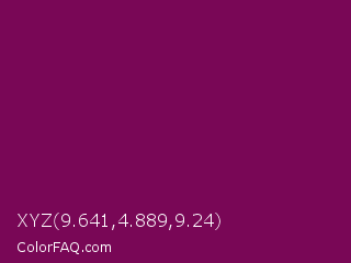 XYZ 9.641,4.889,9.24 Color is a dark magenta color and the nearest color is French Plum #811453. Hex code #790756 and RGB value is rgb(121,7,86). In RGB color space, this color is composed of 47% red, 3% green, 34% blue, In CMYK color space, this color is composed of 0% cyan, 94% magenta, 29% yellow , 53% black , In HSL color space, this color has a hue angle of 318° , 89% saturation and 25% lightness.