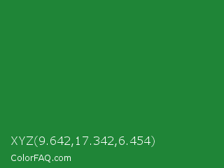 XYZ 9.642,17.342,6.454 Color is a normal green color and the nearest color is Forest Green #228b22. Hex code #1f8537 and RGB value is rgb(31,133,55). In RGB color space, this color is composed of 12% red, 52% green, 22% blue, In CMYK color space, this color is composed of 77% cyan, 0% magenta, 59% yellow , 48% black , In HSL color space, this color has a hue angle of 134° , 62% saturation and 32% lightness.