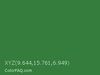XYZ 9.644,15.761,6.949 Color is a normal green color and the nearest color is Killarney #3a6a47. Hex code #357d3d and RGB value is rgb(53,125,61). In RGB color space, this color is composed of 21% red, 49% green, 24% blue, In CMYK color space, this color is composed of 58% cyan, 0% magenta, 51% yellow , 51% black , In HSL color space, this color has a hue angle of 127° , 40% saturation and 35% lightness.