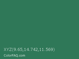 XYZ 9.65,14.742,11.569 Color is a normal green color and the nearest color is Amazon #3b7a57. Hex code #2f7858 and RGB value is rgb(47,120,88). In RGB color space, this color is composed of 18% red, 47% green, 35% blue, In CMYK color space, this color is composed of 61% cyan, 0% magenta, 27% yellow , 53% black , In HSL color space, this color has a hue angle of 154° , 44% saturation and 33% lightness.