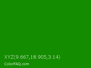 XYZ 9.667,18.905,3.14 Color is a dark green color and the nearest color is India Green #138808. Hex code #148c00 and RGB value is rgb(20,140,0). In RGB color space, this color is composed of 8% red, 55% green, 0% blue, In CMYK color space, this color is composed of 86% cyan, 0% magenta, 100% yellow , 45% black , In HSL color space, this color has a hue angle of 111° , 100% saturation and 27% lightness.