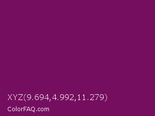 XYZ 9.694,4.992,11.279 Color is a dark magenta color and the nearest color is French Plum #811453. Hex code #760e5f and RGB value is rgb(118,14,95). In RGB color space, this color is composed of 46% red, 5% green, 37% blue, In CMYK color space, this color is composed of 0% cyan, 88% magenta, 19% yellow , 54% black , In HSL color space, this color has a hue angle of 313° , 79% saturation and 26% lightness.
