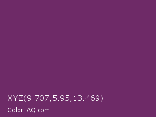XYZ 9.707,5.95,13.469 Color is a dark magenta color and the nearest color is Byzantium #702963. Hex code #6e2a67 and RGB value is rgb(110,42,103). In RGB color space, this color is composed of 43% red, 16% green, 40% blue, In CMYK color space, this color is composed of 0% cyan, 62% magenta, 6% yellow , 57% black , In HSL color space, this color has a hue angle of 306° , 45% saturation and 30% lightness.