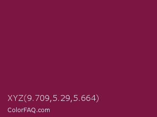 XYZ 9.709,5.29,5.664 Color is a dark rose color and the nearest color is Pansy Purple #78184a. Hex code #7d1542 and RGB value is rgb(125,21,66). In RGB color space, this color is composed of 49% red, 8% green, 26% blue, In CMYK color space, this color is composed of 0% cyan, 83% magenta, 47% yellow , 51% black , In HSL color space, this color has a hue angle of 334° , 71% saturation and 29% lightness.